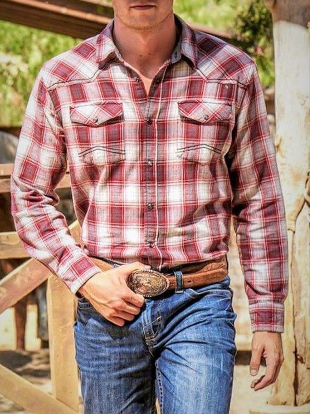 Men's Red and White Plaid Long Sleeve Shirt
