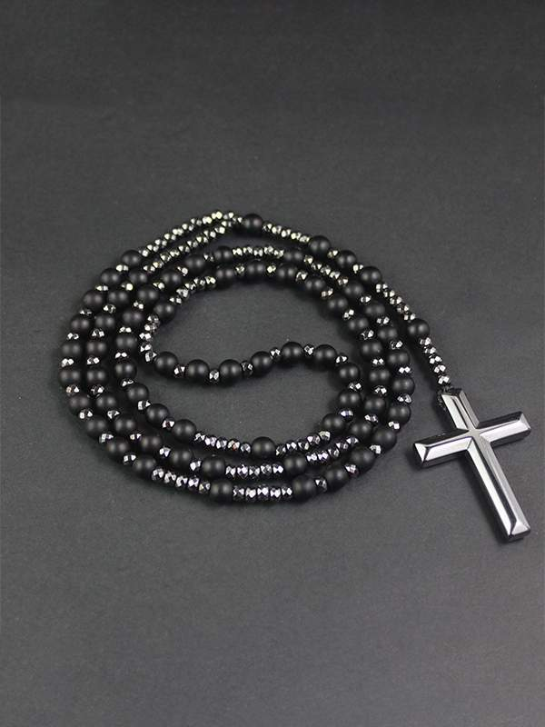 Cross Pendant Black Glitter Matte Onyx Black Gallstone Necklace