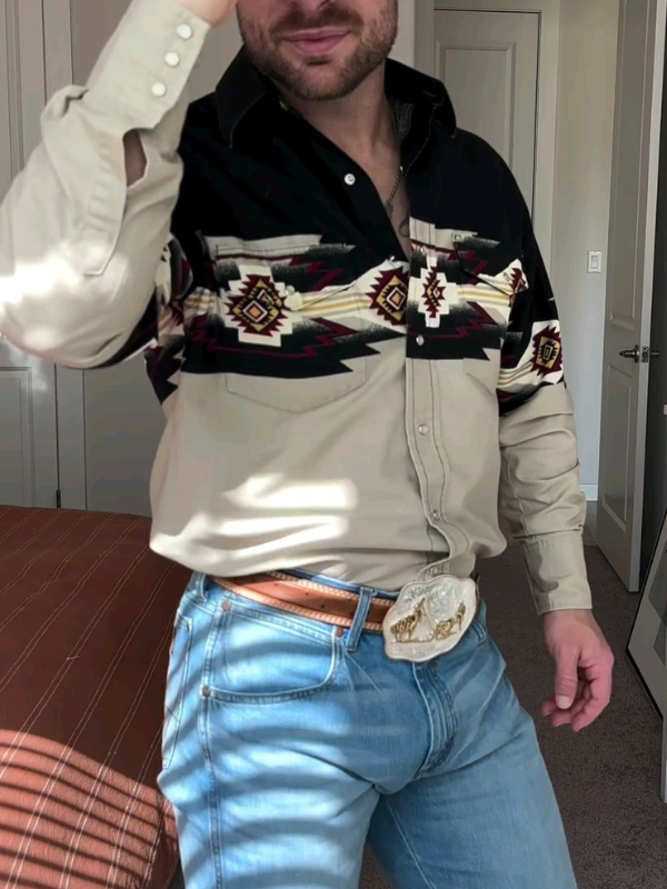 Men's Casual Retro Western Cowboy Stripe Print Long Sleeve Shirt