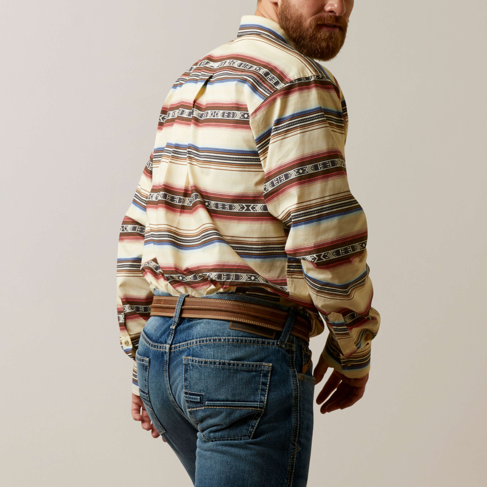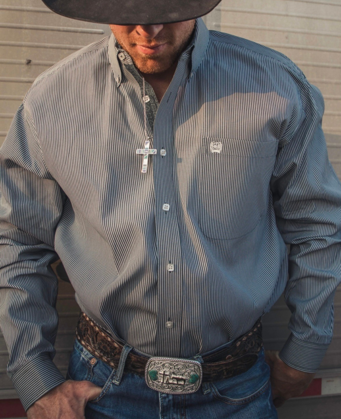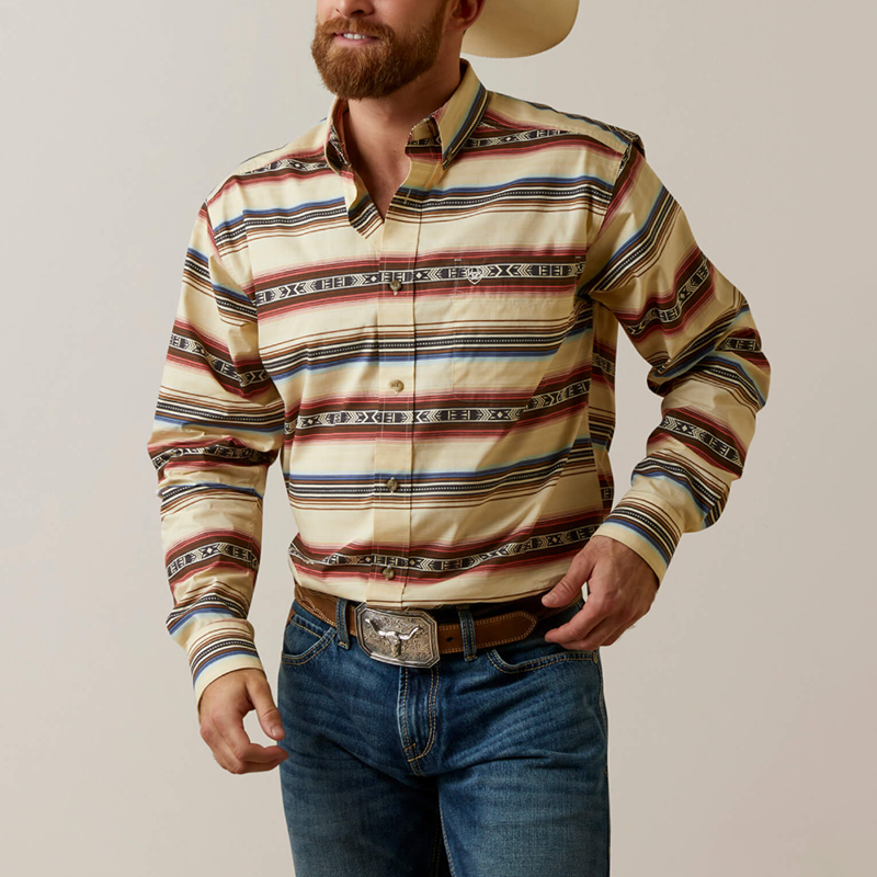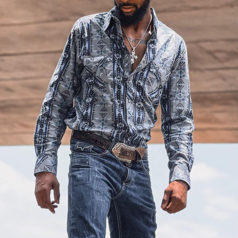 Men's Casual Retro Blue Western Stripe Print Long Sleeve Lapel Shirt