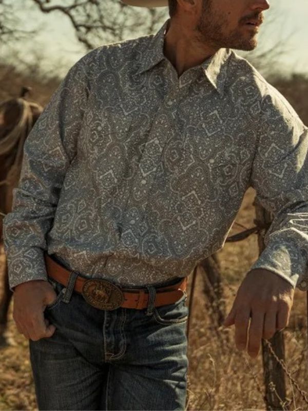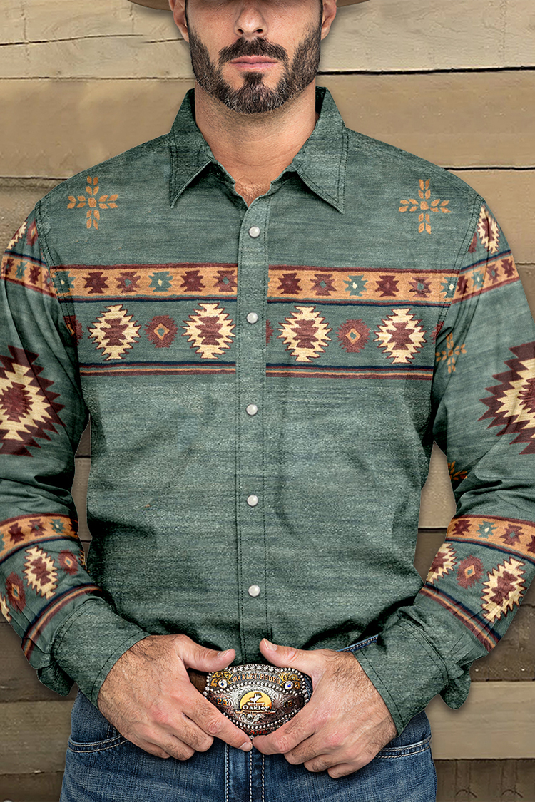 Men's Retro Western Light Green Casual Lapel Long Sleeve Shirt