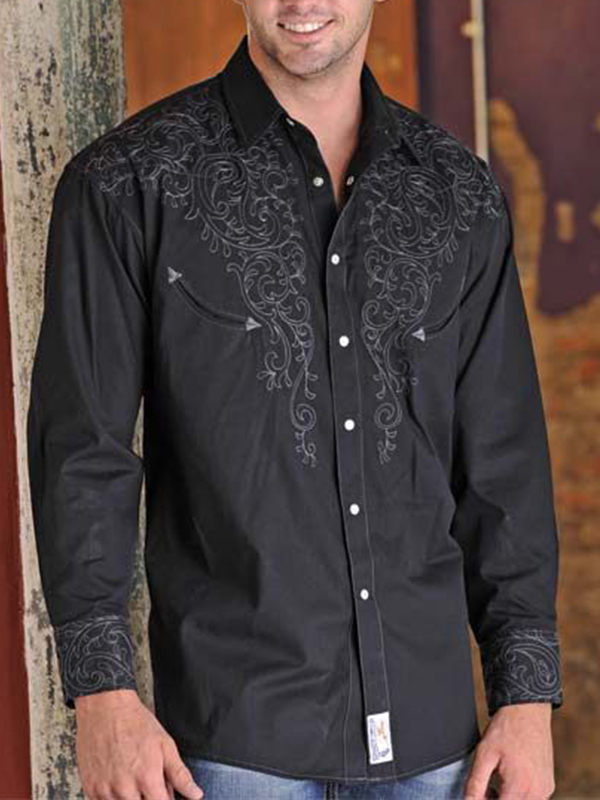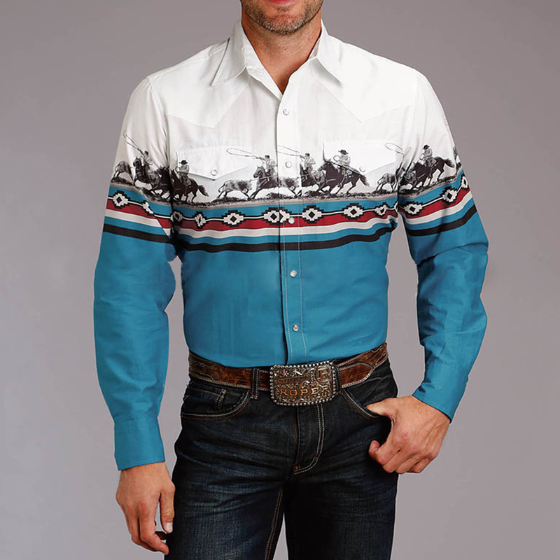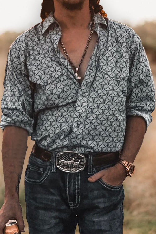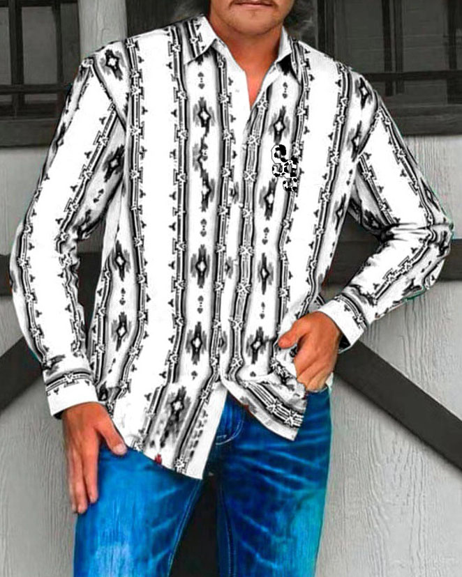 Men's Vintage Button Western Print Long Sleeve Lapel White Shirt