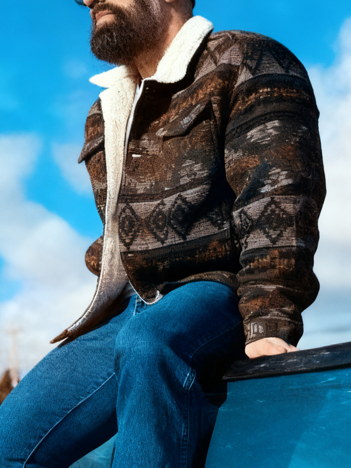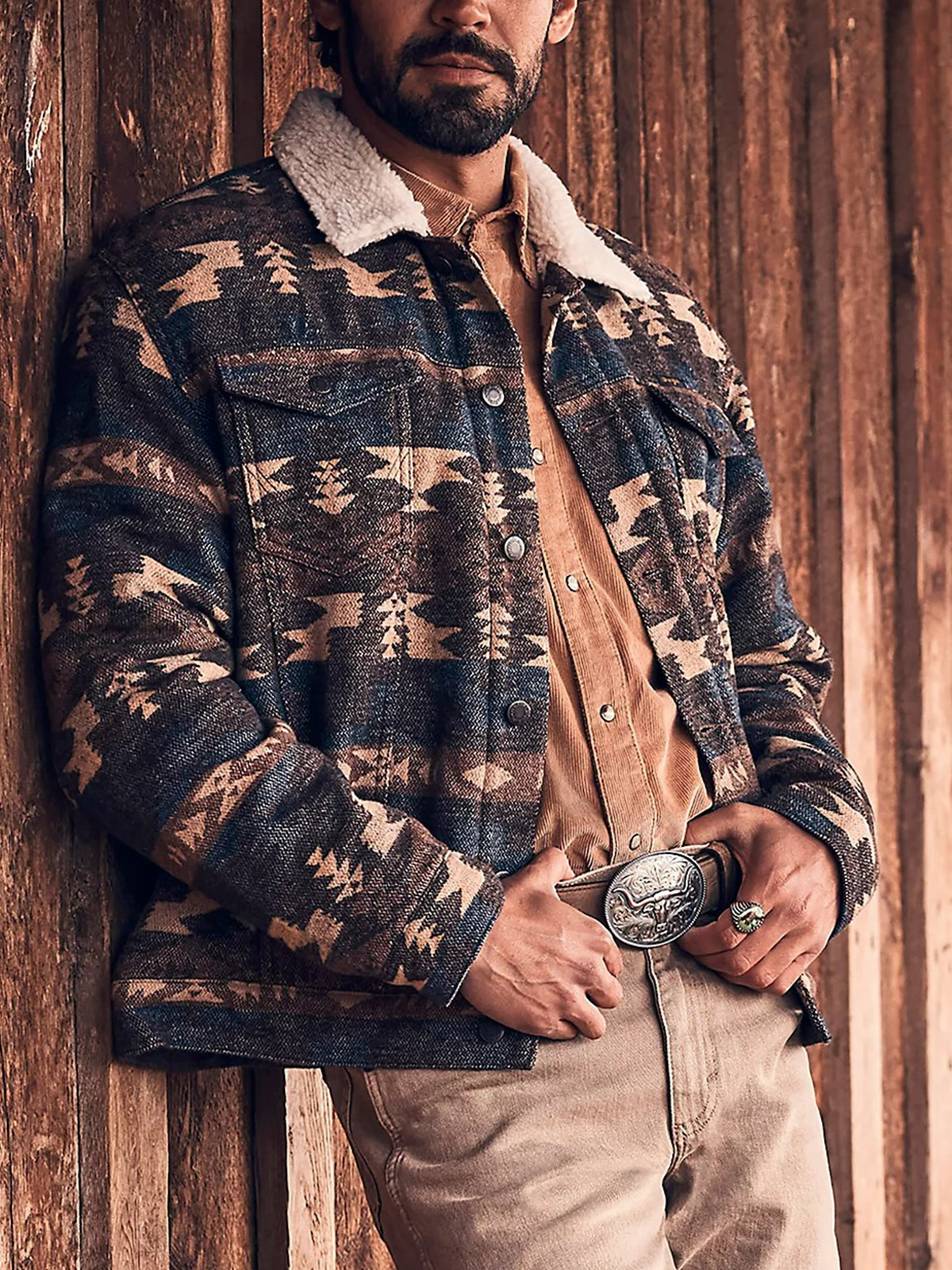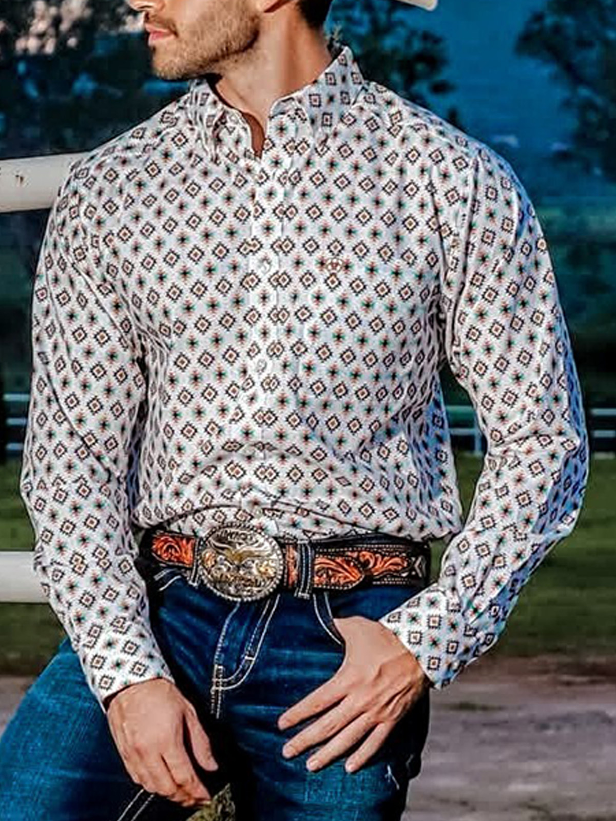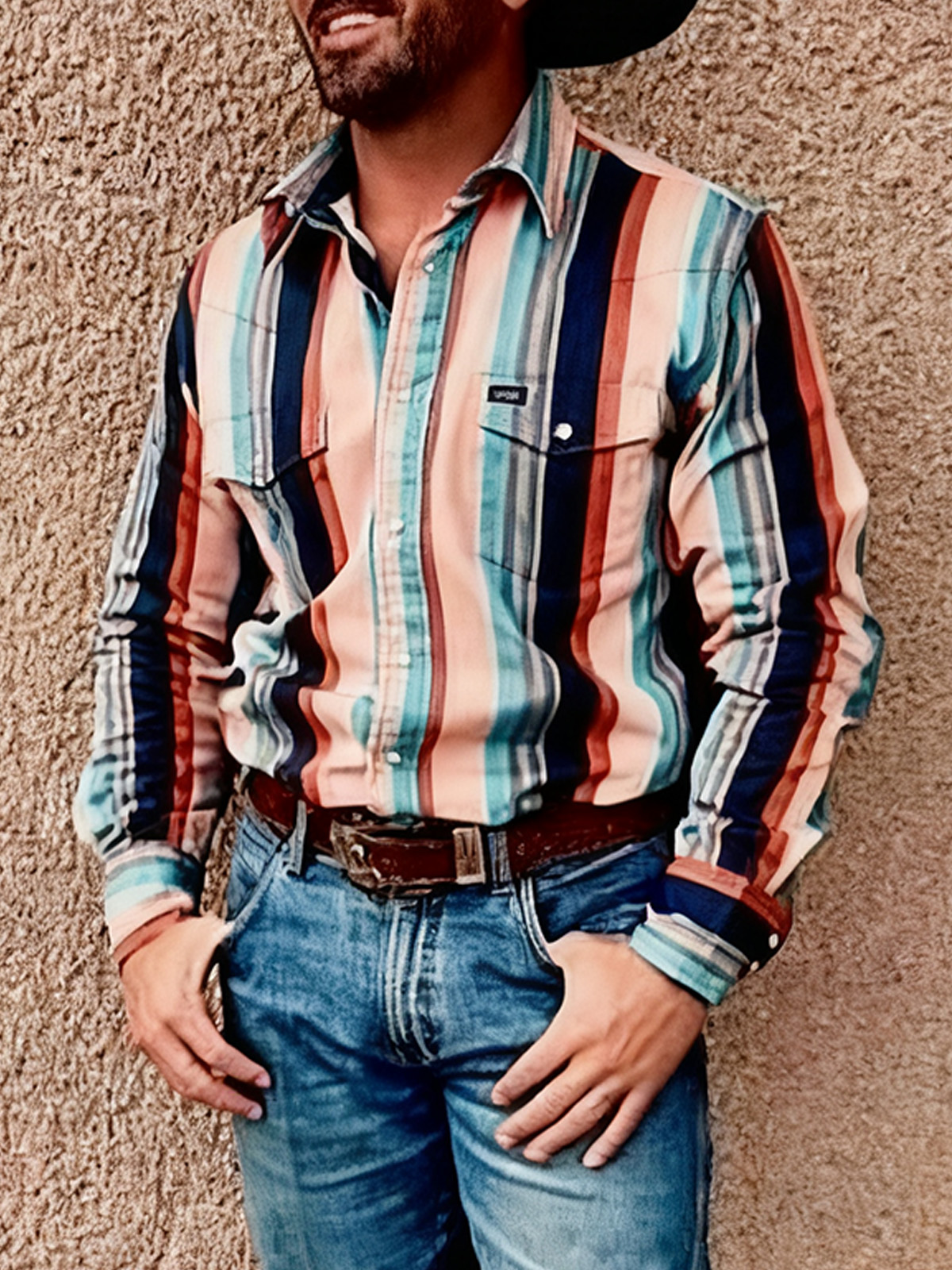 Men's Striped Print Retro Western Fashion Casual Lapel Long Sleeve Shirt