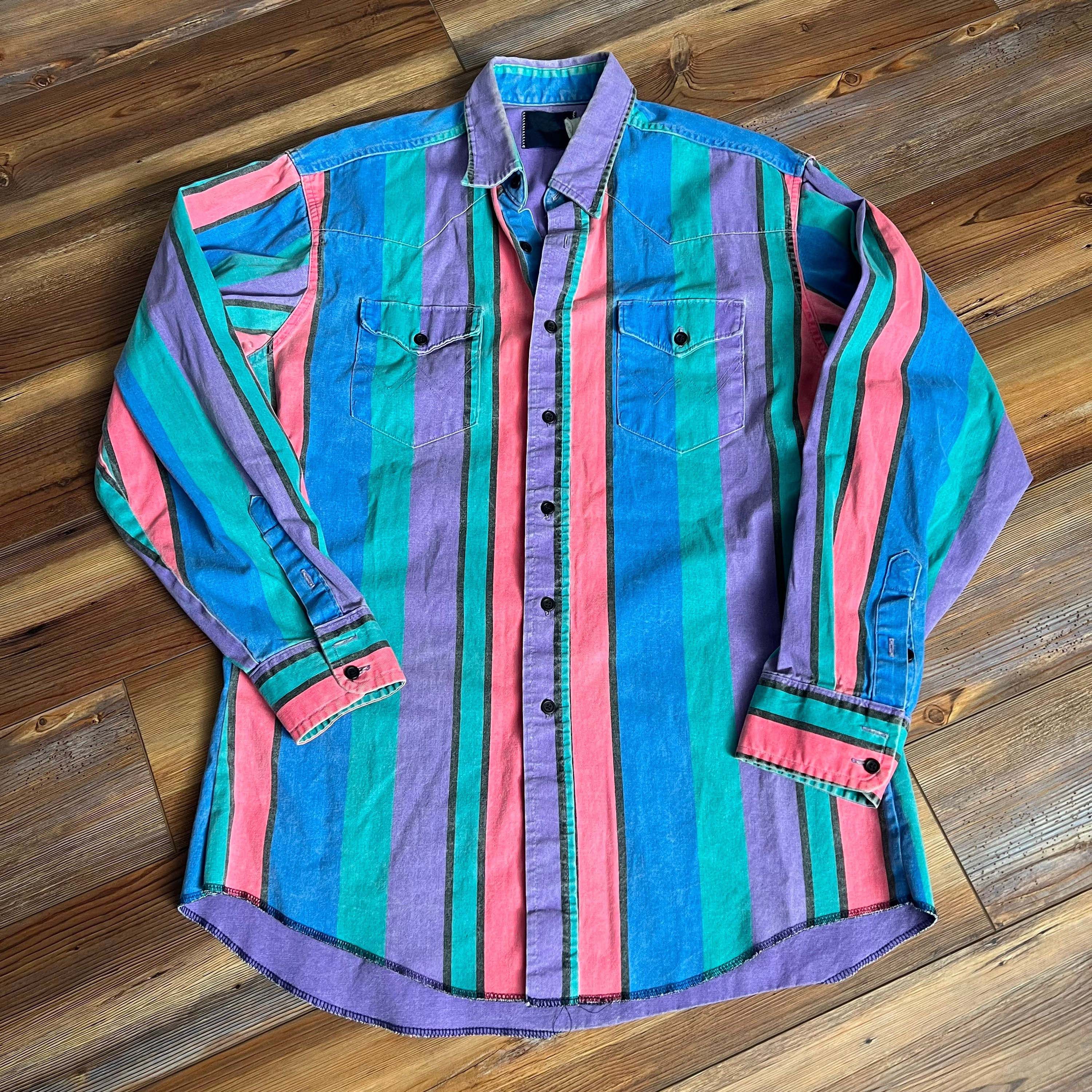 Men's Western Fashion Blue Green Purple Striped Long Sleeve Shirt