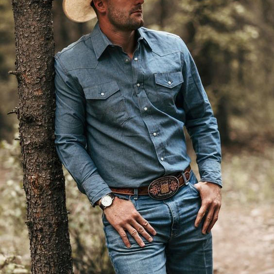 Men's Retro Western Denim Print Casual Lapel Long Sleeve Shirt