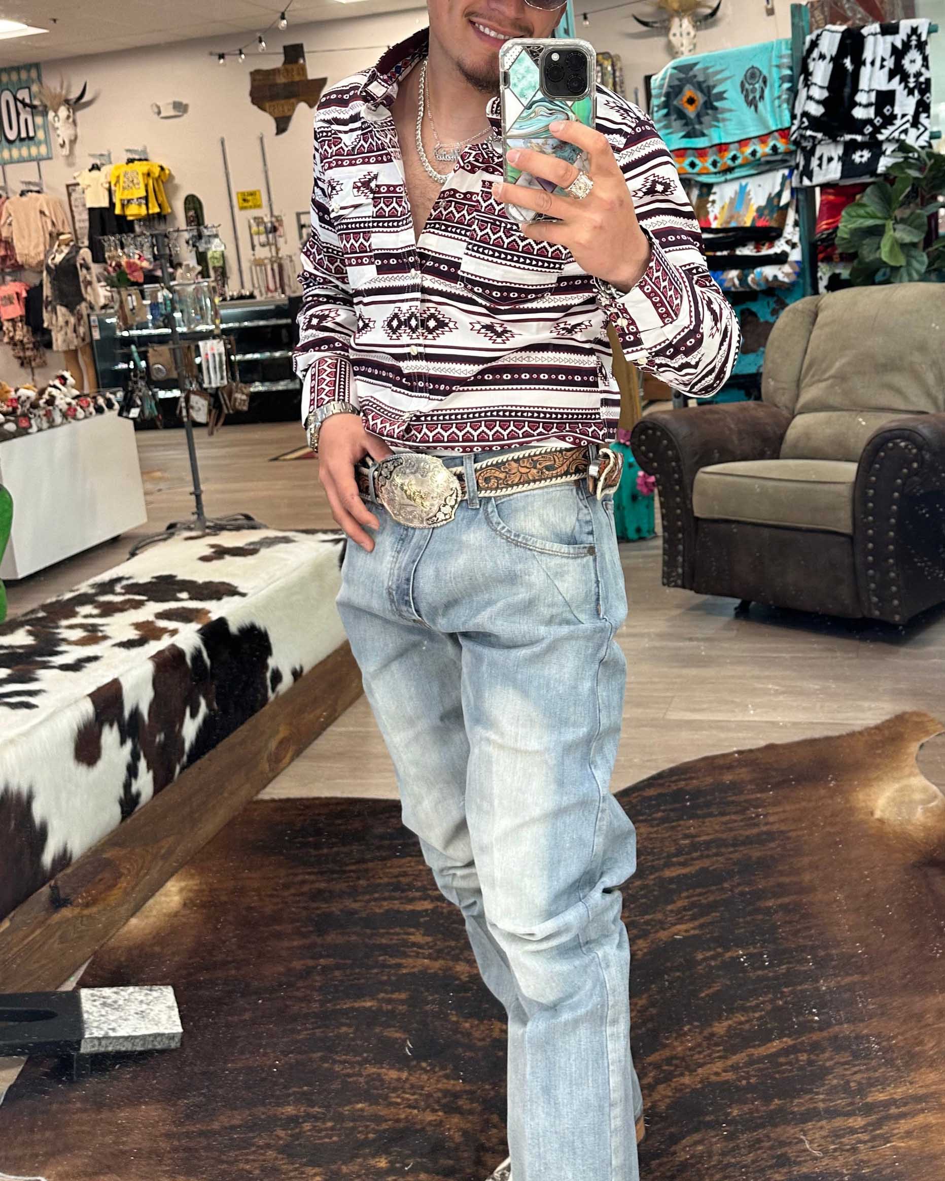 Men's Casual Retro Western Cowboy Stripe Long Sleeve Shirt