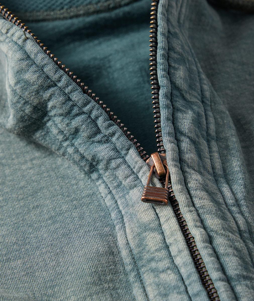 We love this zip hoodie for its outstanding tonal contrasts of French rib and jacquard knit, highlighted by its sun-washed, vintage look. One of our new favorites, it's perfect to grab and go year-round. Raglan sleeves and side entry pockets. Rib knit cuffs and hem. Antiqued zip and hardware.