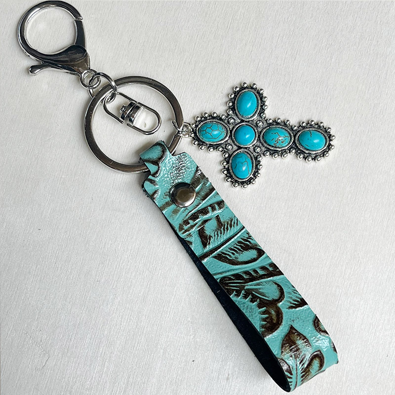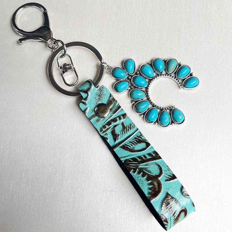 Genuine leather keychain retro ethnic style turquoise cactus western style