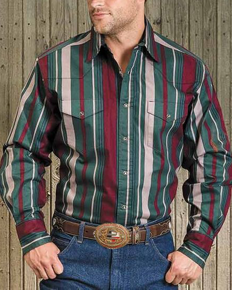 Men's casual retro striped print long sleeve lapel shirt