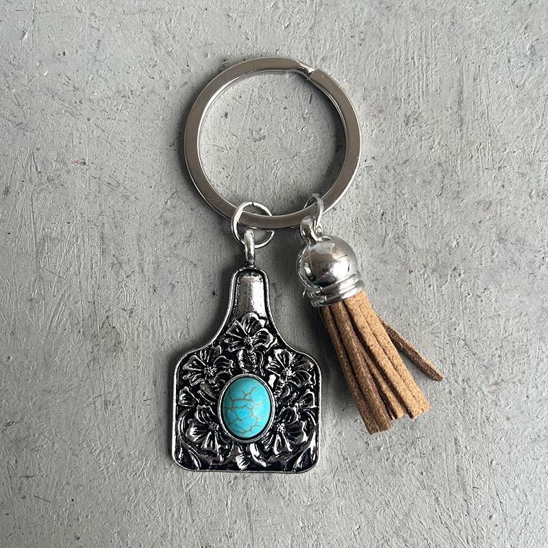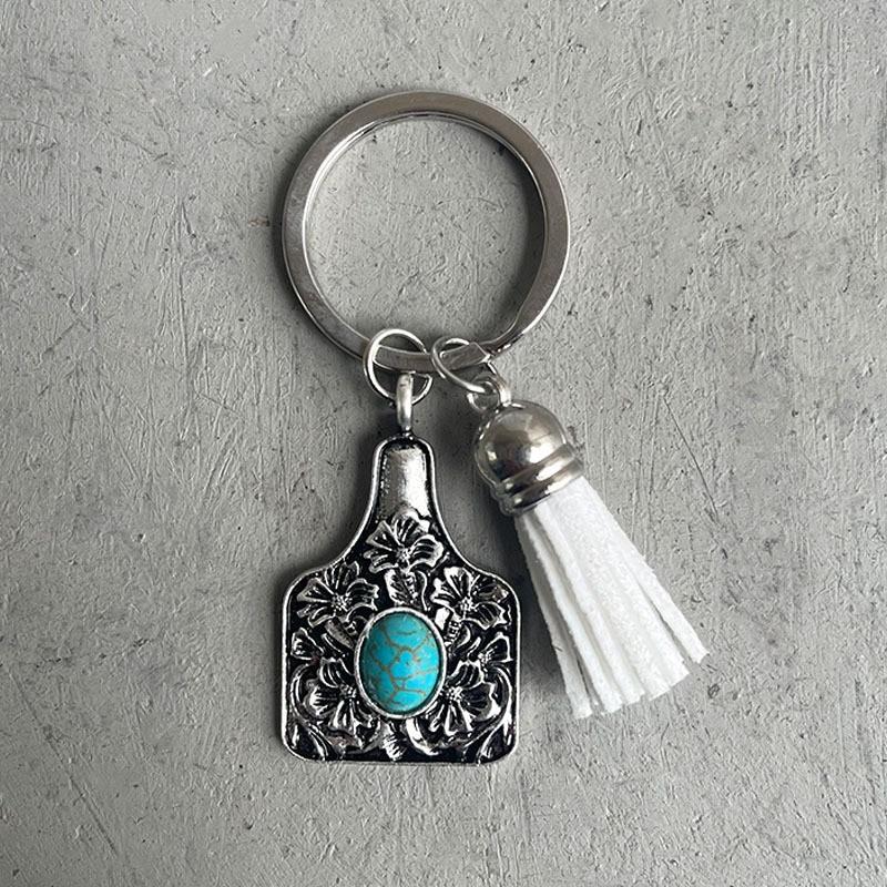 Western cowboy wind anti-lost device turquoise alloy retro cow brand pendant pendant leather tassel keychain